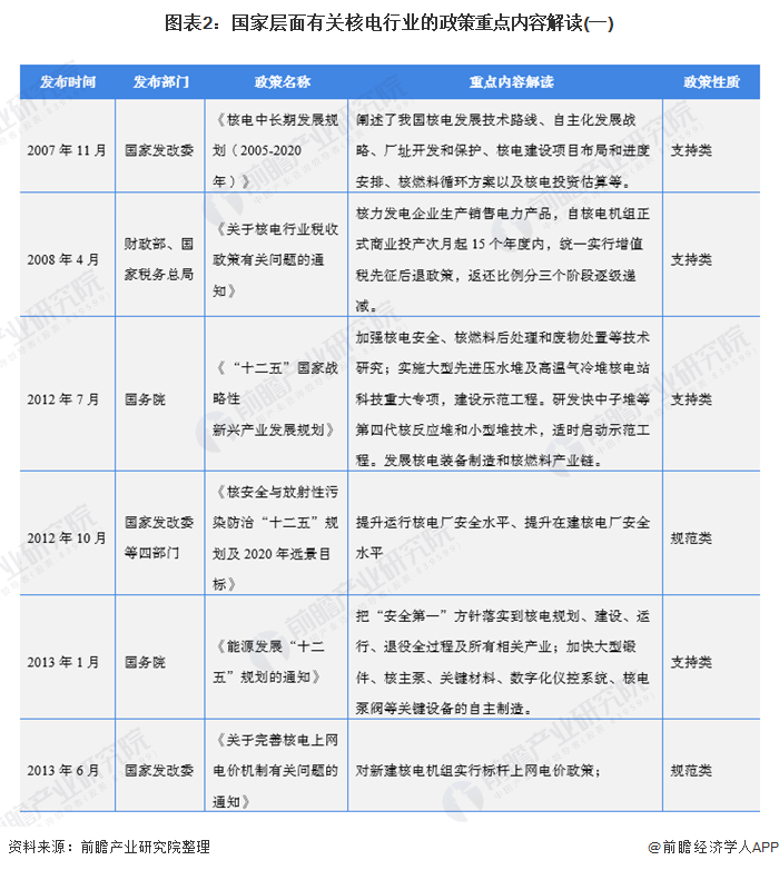 自2007年以來,國務院、國家發(fā)改委、國家能源局等多部門都陸續(xù)印發(fā)了支持、規(guī)范核電行業(yè)的發(fā)展政策,內(nèi)容涉及核電發(fā)展技術路線、核電廠建設規(guī)范、核電廠安全運行規(guī)范、上網(wǎng)電價政策等內(nèi)容: