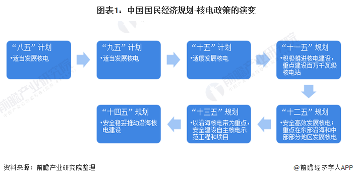 “八五”計劃(1991-1995年)至“十五”計劃(2001-2005年)時期,國家層面提倡:適當、適度發(fā)展核電;從“十一五”規(guī)劃開始,規(guī)劃明確了將積極推進核電建設,且重點建設百萬千瓦級核電站;