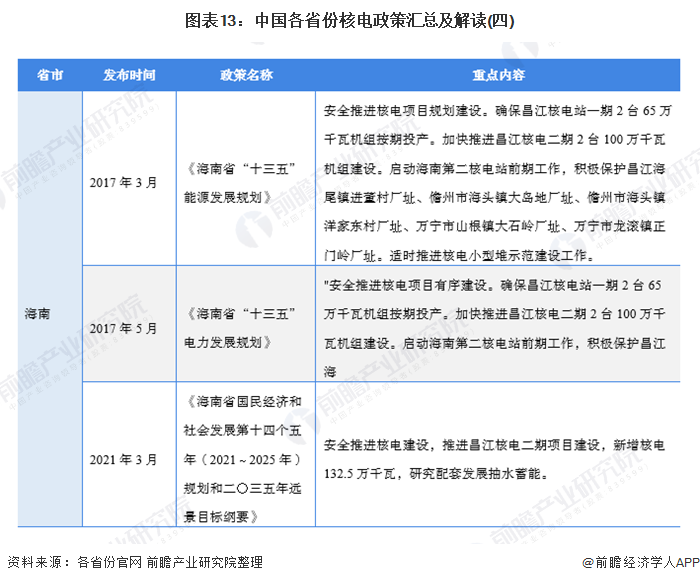 現(xiàn)有或規(guī)劃在建的核電站省份包括:江蘇、浙江、福建、山東、遼寧、廣西、廣東和海南,各省份均在“十三五”、“十四五”時期發(fā)布了推動核電建設的支持性政策,政策內(nèi)容均落實了“安全高效發(fā)展核電產(chǎn)業(yè)”的主旨: