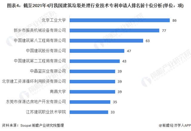 從建筑垃圾處理行業(yè)技術(shù)專利申請(qǐng)人來(lái)看,在申請(qǐng)數(shù)量靠前的企業(yè)及單位專利申請(qǐng)數(shù)量均較少。其中,排在前三名的北京工業(yè)大學(xué)、新鄉(xiāng)市振英機(jī)械設(shè)備有限公司、中國(guó)建筑第八工程局有限公司的專利申請(qǐng)數(shù)量均在100一下,分別為86項(xiàng)、77項(xiàng)和63項(xiàng)。整體來(lái)看,建筑垃圾處理行業(yè)的技術(shù)專利集中度仍處在較低水平,申請(qǐng)單位分散。