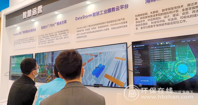 墻面遍布電子屏,ProSee污水廠專家智能決策系統(tǒng)、智慧水廠/污水廠解決方案、DataStorm智慧工業(yè)服務云平臺、海綿城市智慧管控平臺展示,有沒有越看越覺得很有科技范兒?