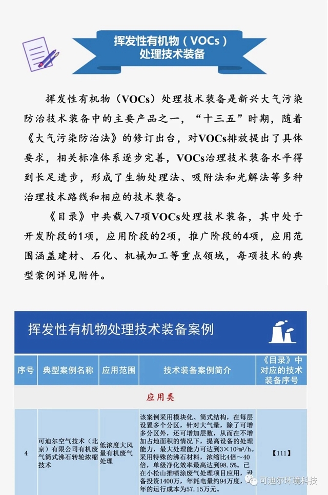 2021年2月25日,中華人民共和國工業(yè)和信息化部發(fā)布《國家鼓勵發(fā)展的重大環(huán)保技術(shù)裝備目錄(2020年版)》供需對接指南之五:揮發(fā)性有機物處理技術(shù)裝備典型案例,《目錄》中共載入7項VOCs處理技術(shù)裝備,分別為開發(fā)階段的1項,應用階段的2項,推廣階段的4項。其中,可迪爾有機廢氣筒式沸石轉(zhuǎn)輪濃縮技術(shù)典型案例錄入應用階段。