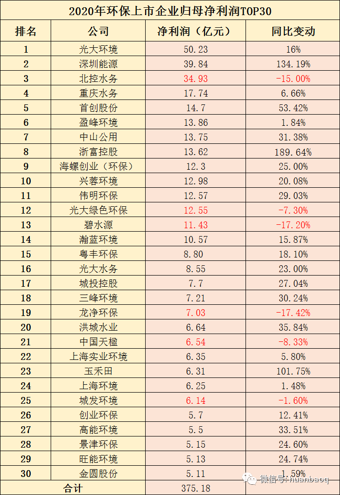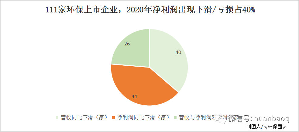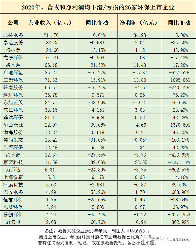 早在3月初,《環(huán)保圈》就已經(jīng)對55家環(huán)保上市企業(yè)的2020年業(yè)績預(yù)告進行了統(tǒng)計分析,結(jié)果發(fā)現(xiàn),55家企業(yè)中,有6成企業(yè)2020年歸母凈利潤實現(xiàn)正增長,4成企業(yè)表現(xiàn)不理想,歸母凈利潤負增長,甚至虧損。如果將55家環(huán)保上市企業(yè)范圍擴大2倍,增加到111家,總體情況是否會發(fā)生變化呢?據(jù)《環(huán)保圈》繼續(xù)跟蹤統(tǒng)計,截止到5月6日,A股/港股已有111家環(huán)保上市企業(yè)如期完成了2020年年報的披露工作(業(yè)績?nèi)珗D附文末),這些上市企業(yè)業(yè)務(wù)涉及環(huán)境監(jiān)測、生態(tài)修復(fù)、垃圾焚燒、環(huán)衛(wèi)、危險廢物、污水處理、供水等各個環(huán)保細分板塊,基本可以說明環(huán)保行業(yè)的整體情況。總體來看,111家上市環(huán)企中,約有6成企業(yè)2020年營業(yè)收入和歸母凈利潤均實現(xiàn)正向增長,4成的企業(yè)要么是營收下滑,要么是歸母凈利潤虧損。圖一:111家環(huán)保上市企業(yè),2020年凈利潤出現(xiàn)下滑/虧損占40%進一步觀察,營收和凈利潤表現(xiàn)均差的26家上市環(huán)企,不乏有排名非??壳暗募毞诸I(lǐng)域的龍頭,如北控水務(wù)、格林美、碧水源、啟迪環(huán)境、東江環(huán)保等。去年業(yè)績罕見出現(xiàn)大“變臉”,足以說明了2020年,在國內(nèi)外疫情的沖擊下,即便是細分領(lǐng)域的優(yōu)秀老兵,也有“馬失前蹄”的時候,好的不好,差的更差,掘金綠水青山比想象中的要難(如圖二所示)!圖二:2020年,營收和凈利潤均下滑/虧損的26家環(huán)保上市企業(yè)營收榜:光大環(huán)境穩(wěn)居第一,百億企業(yè)3家“掉隊”