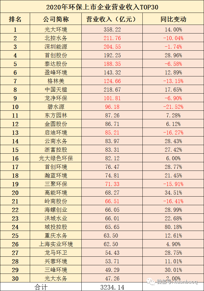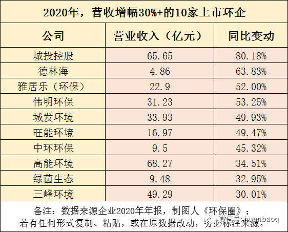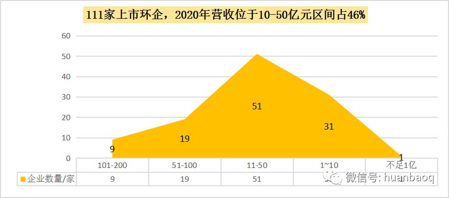 111家環(huán)保上市企業(yè),2020年營收實現(xiàn)正向增長有71家,約占64%,這一比例相較于2019年下降了16%,遠低于預(yù)期,再次印證了去年疫情對我國環(huán)保產(chǎn)業(yè)沖擊。從營收分布區(qū)間來看,111家上市環(huán)企中,突破百億大關(guān)的有9家,分別是光大環(huán)境(358.22億元,14%)、北控水務(wù)(211.76億元,-10.04%)、深圳能源(204.55億元,-1.74%)、首創(chuàng)股份(192.25億元,28.96%)、泰達股份(188.35億元,-6.58%)、盈峰環(huán)境(143.32億元,12.89%)、格林美(124.66億元,-13.15%)、中國天楹(218.67億元,17.65%)、龍凈環(huán)保(101.81億元,-6.9%)。9家百億級的環(huán)保上市企業(yè)中,只有光大環(huán)境、首創(chuàng)股份、盈峰環(huán)境、中國天楹4家禁受住了疫情的壓力,2020年營業(yè)收入實現(xiàn)同比上升,其余5家較上年度都在下滑。而三聚環(huán)保、碧水源和啟迪環(huán)境,曾經(jīng)在2018年-2019年間營收突破百億,一場疫情過后,2020年又從百億營收陣營中“出局”了。111家上市環(huán)企,2020年營收在51億元-100億元區(qū)間有19家,龍馬環(huán)衛(wèi)、興蓉環(huán)境首次擠進50億元營收陣營;而營收在10億元-50億元區(qū)間的上市環(huán)企,有51家,約占半數(shù);營收區(qū)間位于1億元-10億元的“小而美”上市環(huán)企,有31家,它們大多是科創(chuàng)板企業(yè)(如圖三所示)。圖三:111家上市環(huán)企,2020年營收分布區(qū)間圖經(jīng)過2018年的產(chǎn)業(yè)寒冬,2019年的民企易主國資混改熱潮,2020年的新冠肺炎疫情沖擊,現(xiàn)如今,我國環(huán)保產(chǎn)業(yè)間的兼并重組洗牌階段已接近尾聲。從每年營收TOP30強上市環(huán)企排名中,就能窺探一二(如圖四所示)。有的企業(yè)一直穩(wěn)居行業(yè)前幾,比如光大環(huán)境、北控水務(wù)、盈峰環(huán)境;有的企業(yè)一直在走上坡路,排名不停地向前,比如業(yè)績一直保持穩(wěn)健增長的首創(chuàng)股份、首創(chuàng)環(huán)境,高能環(huán)境、瀚藍環(huán)境、海螺創(chuàng)業(yè)、龍馬環(huán)衛(wèi)、興蓉環(huán)境;還有的企業(yè),在這輪“你追我趕”激烈競爭中,沒跟著節(jié)奏發(fā)展趨于緩慢,比如上文提到碧水源、三聚環(huán)保、啟迪環(huán)境。被PPP折斷雙翼的上市民企退了,大型央企來了,地方國資進駐了,我國環(huán)保產(chǎn)業(yè)競爭格局早已不是從前的樣子了。圖四:2020年環(huán)保上市企業(yè)營業(yè)收入TOP30營收增速:雅居樂排名第三,偉明環(huán)保連續(xù)9連增