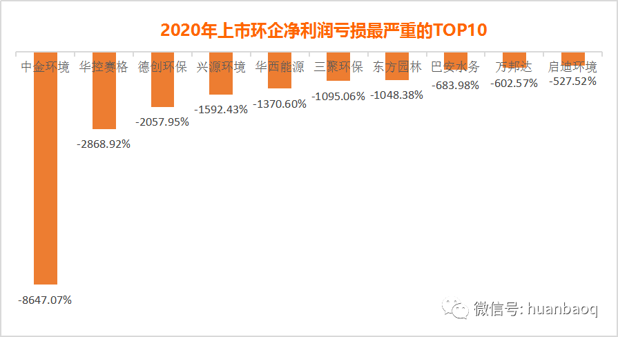 在外界宏觀條件不利、疫情生死攸關(guān)的2020年,仍有一些出類拔萃的上市環(huán)企脫穎出來,從凈利潤增速來看,2020年增速較快TOP10上市環(huán)企非常有看點(如圖八所示)。既有以買賣股權(quán)實現(xiàn)業(yè)績騰飛的聚光科技,也有前幾年負面纏身,疫情之下實現(xiàn)翻盤的中創(chuàng)環(huán)保和淪為*ST科林,還有被PPP拖累,引國資混改的蒙草生態(tài)和節(jié)能鐵漢,以及受疫情影響較小一線固廢名企,如僑銀環(huán)保、玉禾田、浙能錦江環(huán)境、玉禾田、深圳能源等。圖八:2020年環(huán)保上市企業(yè)凈利潤增速較快TOP10首先,凈利潤增幅最大當(dāng)屬聚光科技。2020年歸母凈利潤實現(xiàn)4.89億元,同比增長了1128.82%,主要原因是公司將持有的上海安譜實驗公司25.18%股權(quán),擬以3.6億元價格轉(zhuǎn)讓給廣州德福、杭州青丘。其次是被PPP拖累,遭遇生死劫的蒙草生態(tài)。據(jù)悉,蒙草生態(tài)業(yè)績實現(xiàn)大幅增長得益于旗下秦草、藏草、新草等子公司的運營良好,鞏固其核心競爭力。其中,秦草經(jīng)過激烈競標,在眾多國內(nèi)外知名企業(yè)中勝出,拿下22億元EPC總承包合同,還有子公司快樂小草的足球場建設(shè)、走路草坪等業(yè)務(wù)業(yè)發(fā)展迅猛。還有,連虧2年,終于在2020成功扭虧為盈的中創(chuàng)環(huán)保(原三維絲)也值得一提。有分析人士認為,隨著原股東“淡出”,上海中創(chuàng)控股后,雖然從經(jīng)營數(shù)據(jù)上看,已有好轉(zhuǎn)趨勢,但要消除持續(xù)多年的負面影響還需觀察。最后是受疫情影響較小,又趕上垃圾分類、市政環(huán)衛(wèi)好時候的僑銀環(huán)保。2020年營收同比增長28.87%,凈利潤大增186.03%,主要是去年疫情免收增值稅、環(huán)衛(wèi)運營項目充沛等影響。接下來,這些企業(yè)2020年經(jīng)營狀況不免有點慘淡了,真可謂旱的旱死,澇的澇死。在111家上市環(huán)企中,2020年歸母凈利潤同比下滑的有26家,虧損有20家(如圖九所示),累計虧損金額高達132億元,京藍科技、中金環(huán)境、啟迪環(huán)境、三聚環(huán)保、東旭藍天都虧損了10億元以上。可喜的是,博天環(huán)境雖然繼續(xù)虧損,但虧損幅度收窄,相較于上年同期增長了40.57%。圖九:2020年歸母凈利潤實現(xiàn)虧損的20家上市環(huán)企如果要在這20家虧損企業(yè)中,找到2020上市環(huán)企虧損幅度最大的“十大虧損王”,如圖十所示中金環(huán)境、德創(chuàng)環(huán)保、華控賽格、興源環(huán)境、三聚環(huán)保、東方園林、巴安水務(wù)、萬邦達、啟迪環(huán)境、清水源都“榜上有名”。圖十:2020上市環(huán)企虧損幅度最大的“十大虧損王”中金環(huán)境成為當(dāng)之無愧的“虧損王”,2020年凈虧損高達19.6億元,相較于2019年的2292萬元,下降了8647.07%,驚呆業(yè)界。據(jù)筆者觀察,其實從2018年中金環(huán)境就已經(jīng)開始走下坡路了。2018年,凈利潤4.3億元,比上年下滑27.17%,2019業(yè)績繼續(xù)下滑,凈利潤僅為2292萬,到了2020年,經(jīng)營更加惡化,虧損了19.6億元。巨虧原因主要受新冠肺炎疫情及市場環(huán)境影響,子公司金泰萊、中咨華宇無法完成業(yè)績承諾,面臨巨額資產(chǎn)減值問題,預(yù)計計提商譽減值金額共計17.50億元至19億元之間。同樣經(jīng)營惡化,由盈轉(zhuǎn)虧還有華控賽格、德創(chuàng)環(huán)保,這兩家企業(yè)2019年同期凈利潤分別為594萬元、625萬,到了2020年,受疫情及全球經(jīng)濟衰退的影響,環(huán)保工程業(yè)務(wù)出現(xiàn)下滑,凈利潤分別虧損約1.66億元、1.22億元,同比下降2868.92%、2057.95%。縱觀這些虧損上市環(huán)企,雖然每家企業(yè)跌倒原因不同,但年報都不約而同提及幾個方面:國內(nèi)外新冠疫情導(dǎo)致復(fù)工復(fù)產(chǎn)、項目結(jié)算周期延遲和政府支付能力下滑;環(huán)保市場競爭加劇,導(dǎo)致項目毛利減少;部分環(huán)保細分領(lǐng)域,僧多肉少,市場趨于飽和。老舊項目回款不暢,應(yīng)收賬款居高不下,導(dǎo)致壞賬減值計提損失。如東江環(huán)保年報提到,營收下滑主要系疫情影響,工業(yè)企業(yè)開工減少,導(dǎo)致危廢處理量下降;且隨著新增產(chǎn)能陸續(xù)投產(chǎn),行業(yè)競爭日趨激烈,市場收運和處理費價格有所下滑。再如中環(huán)裝備年報提到,面對傳統(tǒng)煙氣治理市場飽和,獲取大氣減排訂單變得越來越難,對公司業(yè)績造成不小的影響。無論如何,凡此過往皆為序章,最難的2020年都已過去了,面向“十四五”,所有企業(yè)都將面臨新的機遇和挑戰(zhàn)。業(yè)績好的2021年再接再厲,續(xù)寫輝煌;業(yè)績差的則要再接再厲,打個漂亮的翻身仗。未來,《環(huán)保圈》將持續(xù)關(guān)注業(yè)內(nèi)企業(yè)動態(tài),觀察行業(yè)大勢,為讀者奉獻更多精彩的分析。