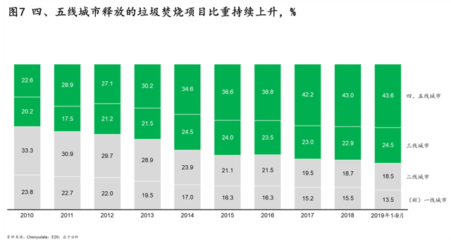 二是四、五線城市釋放的垃圾焚燒項(xiàng)目比例越來越高。目前,(新)一線、二線、三線城市的項(xiàng)目增速都在放緩甚至下降,未來5~10年最大的增長(zhǎng)將是四、五線城市。例如,2019年四、五線城市的垃圾焚燒項(xiàng)目占比高達(dá)43.6%,同期的新一、二線城市則分別只占到13.5%和18.5%(見圖7)。