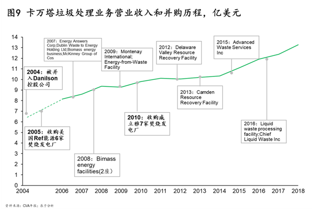 發(fā)達(dá)國(guó)家的成熟市場(chǎng)經(jīng)驗(yàn)表明,環(huán)保政策和行業(yè)標(biāo)準(zhǔn)的趨嚴(yán)會(huì)推動(dòng)行業(yè)整合。例如在美國(guó),自20世紀(jì)90年代以來,一系列針對(duì)垃圾焚燒行業(yè)的細(xì)化標(biāo)準(zhǔn)不斷出臺(tái),大量中小型公司受到嚴(yán)峻考驗(yàn),擁有技術(shù)優(yōu)勢(shì)的卡萬塔通過并購持續(xù)提高市場(chǎng)份額,現(xiàn)已成為美國(guó)最大的垃圾焚燒發(fā)電投資商,占據(jù)高達(dá)67%的市場(chǎng)份額(見圖9)。