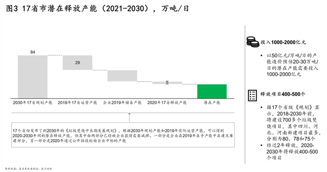 截至當前,已有17個省市發(fā)布了垃圾焚燒中長期發(fā)展規(guī)劃,根據(jù)這些省市到2030年的相關產(chǎn)能規(guī)劃,未來10年仍將有20~30萬噸/日的新增產(chǎn)能,釋放項目400~500個,投資規(guī)模1000~2000億元(見圖3)。而如果放眼全國,這三個數(shù)字只會更大。這一體量不容小覷,相當于當前行業(yè)排名第2-9位企業(yè)的在手產(chǎn)能之和,釋放的項目數(shù)量則相當于過去3年的全部開標項目數(shù)量。