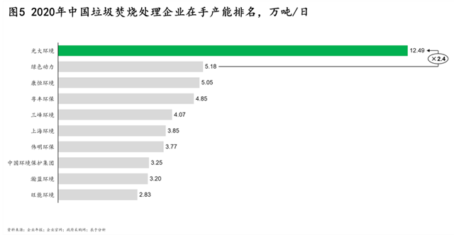 當前,我國垃圾焚燒處理市場呈現(xiàn)“一枝獨秀”的競爭格局:處于領先地位的光大環(huán)境,連續(xù)多年排名第一,截至2020年底,在手產(chǎn)能[2]12.49萬噸/日,是排在第二位的綠色動力5.18萬噸/日的2.4倍,優(yōu)勢十分明顯,而排在第2-9位的企業(yè),在手產(chǎn)能大多在3-5萬噸/日左右,實力相當,差距不大(見圖5)。