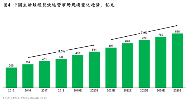 回顧“十三五”,伴隨垃圾焚燒項目投建的突飛猛進,運營市場同樣快速增長,期間年復合增長率11.3%,到2020年運營規(guī)模達到544億元。展望“十四五”,在人均垃圾產(chǎn)生量以及垃圾焚燒比例持續(xù)上升的有利驅動下,我們預計垃圾焚燒運營規(guī)模仍將保持7.9%的年復合增速,到2025年達到818億元(見圖4)。隨著行業(yè)監(jiān)管日趨嚴格,部分企業(yè)包括政府投資項目在技術、運營方面能力不足問題凸顯,這為行業(yè)內(nèi)優(yōu)質企業(yè)在運營管理對外服務提供了“輕資產(chǎn)化”的廣闊商機。