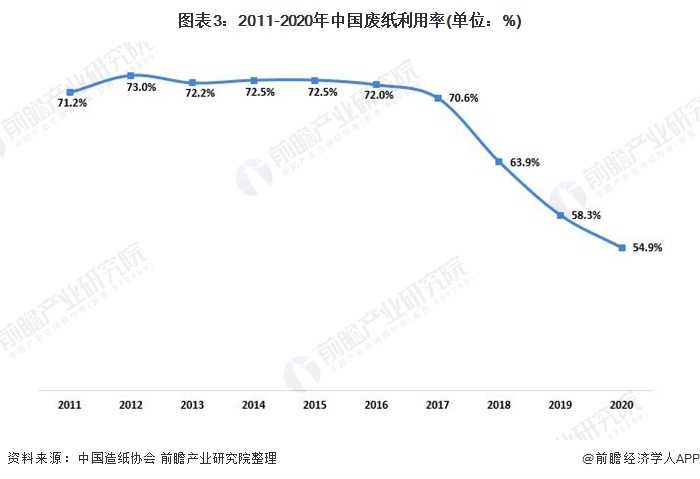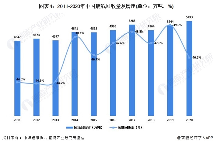 近年來,政府嚴(yán)格控制廢紙等固體廢物的進(jìn)口,為中國廢紙回收企業(yè)的發(fā)展提供了機(jī)會(huì)。2020年,中國回收廢紙總量5493萬噸,同比增長4.75%,廢紙回收率達(dá)到46.5%。