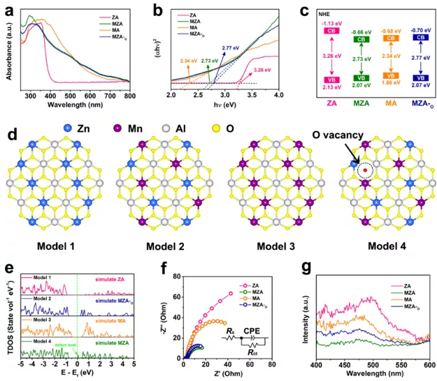 在本研究中,我們旨在揭示金屬取代效應(yīng)增強LDH光催化性能的機理,特別是闡明錳取代和氧空位對提高MZA光催化活性的貢獻。紫外可見吸收光譜(圖2a)和帶隙寬度(圖2b)顯示與ZA和MA相比,MZA的帶隙更適合光催化反應(yīng)。值得注意的是,MZA的帶隙比MZA-o略窄,這意味著帶隙的縮短不僅來自Mn取代,O空位在這個過程中也起到了一定的輔助作用。圖2c顯示了催化劑的能帶結(jié)構(gòu),觀察到MZA和MZA-o的價帶位置相近,而MZA的導(dǎo)帶低于MZA-o,說明氧空位對縮短帶隙的作用機制是降低導(dǎo)帶。在密度泛函理論計算中我們補充了模型4(圖2d),即具有一個氧空位的模型2(氧空位位置的選擇遵循最低總能量的原則),并計算了模型1-4的總態(tài)密度(TDOS)。如圖2e所示,模型的帶隙順序與圖2b中實驗確定的帶隙結(jié)果一致,其中模型2和模型4具有非常相似的能帶結(jié)構(gòu),兩者的區(qū)別在于模型4的能帶結(jié)構(gòu)中出現(xiàn)了一個明顯的中間能級,這表明O空位對縮短帶隙的貢獻是通過缺陷能級的形成來實現(xiàn)的。因此我們認(rèn)為Mn取代和O空位的協(xié)同作用是帶隙縮短的原因,其中Mn取代的貢獻占主導(dǎo)地位,O空位的作用相對較弱。此外,催化劑的阻抗譜(圖2f)和穩(wěn)態(tài)熒光光譜(圖2g)的結(jié)果進一步證實了MZA的優(yōu)異光催化活性歸因于Mn取代和O空位,并且在提高載流子轉(zhuǎn)移能力方面,Mn取代的貢獻仍然大于O空位。