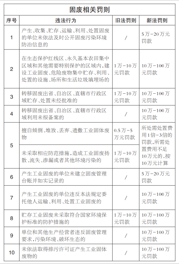 是否建立了工業(yè)固廢管理臺賬,是否對暫時(shí)不利用或者不能利用的固廢建設(shè)了貯存設(shè)施,或者采取了無害化處置措施等。若有工業(yè)固廢有關(guān)違法行為,則按照新固廢法第102條進(jìn)行處罰,最高可以罰100萬元。(固廢有關(guān)違法行為和罰則詳見下圖)