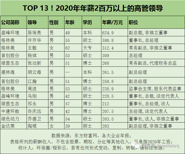 誰(shuí)是環(huán)保行業(yè)“最強(qiáng)打工人”?首先來看看整體情況,應(yīng)該說,環(huán)保企業(yè)高管的薪酬水平差距還是挺大的。總體來看,217位上市環(huán)企高管,去年年薪累計(jì)高達(dá)2.1億元,平均每人97萬元/年,每月近9萬元。也就是說,從平均水平上看,環(huán)保企業(yè)高管的年薪已經(jīng)達(dá)到“百萬級(jí)”了。但事實(shí)上,每個(gè)人的情況差別非常大。最高的,可以拿到625萬元;最低的,則只有2.4萬元,足足相差了260倍,簡(jiǎn)直是天壤之別。為了便于觀察,我們把高管年薪分為“100萬元以上”、“50萬-100萬元之間”,以及“50萬元以下”三個(gè)檔。217位高管中,年薪收入在百萬元以上的有71位,約占33%;年薪在50萬元-100萬元之間的有112位,約占52%;還有15%的企業(yè)高管,去年年薪收入在50萬元以下,約占15%左右(如圖一所示)。圖一:217位上市環(huán)企高管薪酬收入分布也就是說,217位高管中,有1/3收入較高,在100萬元以上;有一半收入居中,在50萬-100萬元之間;還有15%收入“偏低”,在50萬元以下。如果再拔高一個(gè)級(jí)別,看一看收入兩百萬元以上的,就只剩下為數(shù)不多的13個(gè)人了,分別供職于盈峰環(huán)境、格林美、首創(chuàng)股份、綠茵生態(tài)、中建環(huán)能、綠色動(dòng)力等8家上市環(huán)企(如圖二所示)。圖二:年薪過200萬的13位上市環(huán)企高管其中,年薪最高的當(dāng)屬盈峰環(huán)境副總裁陳培亮,去年年薪高達(dá)625萬元,比總裁馬剛還要高出396萬元,可謂是環(huán)保領(lǐng)域的“最強(qiáng)打工人”。很多人或許對(duì)陳培亮還不夠了解,其實(shí)他在成為盈峰環(huán)境副總裁之前,就已經(jīng)有非常光鮮的履歷。早在10年前的2010年,38歲的他就已經(jīng)成為中聯(lián)重科的副總裁,在他的帶領(lǐng)下,中聯(lián)重科大力研發(fā)環(huán)衛(wèi)裝備制造,逐步成為環(huán)保行業(yè)的龍頭企業(yè)。正是由于其在環(huán)衛(wèi)裝備制造的杰出表現(xiàn),5年前,盈峰環(huán)境斥巨資從中聯(lián)重科購(gòu)買中聯(lián)環(huán)境(現(xiàn)盈峰中聯(lián))全部股份,而作為中聯(lián)環(huán)境曾經(jīng)的總經(jīng)理陳培亮,自然也被委以重用,給予了非常高的薪酬。從盈峰中聯(lián)的表現(xiàn)來看,應(yīng)該說,這份年薪是他應(yīng)得的。排名第二的是格林美的兩位高管——55歲的董事長(zhǎng)許開華(587萬元/年)和62歲的常務(wù)副總王敏(312萬元/年)。值得一提的是,相比2019年(年薪805萬元),許開華在2020年的年薪已經(jīng)“自降”了218萬元,這或許與公司去年的凈利潤(rùn)下滑有關(guān)。217位上市環(huán)企高管中,有58位,占比約1/4的高管年薪在100萬元-200萬元之間。其中,年薪150萬元以上的有:中持股份副總經(jīng)理張翼飛、東江環(huán)保董事長(zhǎng)譚侃、節(jié)能國(guó)禎創(chuàng)始人李煒、東方園林董事長(zhǎng)劉偉杰、博天環(huán)境董事長(zhǎng)趙笠鈞、瀚藍(lán)環(huán)境總經(jīng)理金鐸、清新環(huán)境總裁李其林、維爾利董事長(zhǎng)李月中等。年薪在100萬元-150萬元之間的,多數(shù)都是成長(zhǎng)較快、發(fā)展極具潛力的新上市環(huán)企,比如去年六五環(huán)境日剛上市的三峰環(huán)境,其董事長(zhǎng)雷欽平、總經(jīng)理王小軍、副總經(jīng)理司景忠年薪都是在120萬元-140萬元之間。再如去年5月8日在科創(chuàng)板上市的金科環(huán)境,其董事長(zhǎng)張慧春、總經(jīng)理劉正洪和副總經(jīng)理崔紅梅年薪也都在100萬元左右,其中張慧春和劉正洪薪資收入相同,去年年薪均為107萬元。總的來說,以上就是環(huán)保行業(yè)收入最高的群體了。從年薪上看,收入相對(duì)更高的還是民企,比如盈峰環(huán)境、格林美、維爾利,以及“混改”之前的中持股份、國(guó)禎環(huán)保、博天環(huán)境、清新環(huán)境等等。這些企業(yè),基本也代表著環(huán)保行業(yè)的最高水準(zhǔn),企業(yè)效益更好,所以高管薪酬更高也就不足為怪了。董事長(zhǎng)年薪排行:最低的只有2.5萬元!