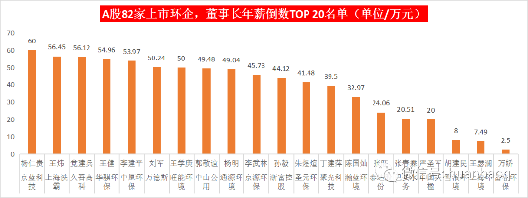 看完了整體的情況,再來看看董事長(zhǎng)這個(gè)維度的排名。在“A股上市環(huán)企董事長(zhǎng)年薪TOP20榜單”中,格林美的許開華以587萬元高居榜首,比第二名(盈峰環(huán)境董事長(zhǎng)馬剛)和第三名(綠茵生態(tài)祁永)的總和還要高出150萬元。(如圖三所示)。圖三:A股82家上市環(huán)企,董事長(zhǎng)年薪排名前TOP20也有的老板不舍得為自己開工資,在圖四“董事長(zhǎng)年薪倒數(shù)TOP20榜單”中,2020年年薪最低的董事長(zhǎng)只有2.5萬元,月平均工資約2000元,這水平都抵不上一位普通的職員。圖四:A股82家上市環(huán)企,董事長(zhǎng)年薪倒數(shù)TOP20這位拿著2.5萬元年薪的董事長(zhǎng),就是富春環(huán)保董事長(zhǎng)萬嬌。公開資料顯示,富春環(huán)保董事長(zhǎng)萬嬌是一位1988年出生,年僅33歲的女掌門人,但其掌門的富春環(huán)保,市值則已高達(dá)56億元。眾所周知,富春環(huán)保是一家剛剛經(jīng)歷了“混改”的企業(yè),去年南昌市國(guó)資委剛剛?cè)胫?,萬嬌則是由南昌國(guó)資提名,代替原董事長(zhǎng)的人選。事實(shí)上,在統(tǒng)計(jì)董事長(zhǎng)薪資收入時(shí),我們發(fā)現(xiàn)了一個(gè)有趣的現(xiàn)象——好多上市環(huán)企,副總、總經(jīng)理的年薪都要高于董事長(zhǎng)!甚至有的董事長(zhǎng)(如首創(chuàng)股份劉永政),都沒有在公司領(lǐng)取任何報(bào)酬!不過,這些董事長(zhǎng)收入較低的企業(yè),很多還都是業(yè)績(jī)表現(xiàn)不錯(cuò)的企業(yè),比如瀚藍(lán)環(huán)境、中國(guó)天楹、上海環(huán)境、富春環(huán)保等。或許,董事長(zhǎng)情愿“讓賢”,讓更專業(yè)的人才來管理企業(yè),并給予更高的報(bào)酬,也是這些企業(yè)發(fā)展更好的原因之一吧。總經(jīng)理年薪排行:首創(chuàng)股份位居第二看完董事長(zhǎng)的,再來看總經(jīng)理的。首先,很多環(huán)保公司,董事長(zhǎng)和總經(jīng)理都是一人兼任,如格林美許開華、僑銀環(huán)保劉少云、景津環(huán)保姜桂廷、金達(dá)萊廖志民、通源環(huán)保楊明、恒譽(yù)環(huán)保牛斌、奧福環(huán)保潘吉慶等(如圖五所示)。同時(shí),這些董事長(zhǎng)兼總經(jīng)理幾乎都是清一色的男性。年紀(jì)最大是去年科創(chuàng)板上市的恒譽(yù)環(huán)保創(chuàng)始人牛斌,今年65歲;最小的當(dāng)數(shù)“環(huán)二代”,子承父業(yè)的王鵬鷂,今年32歲。圖五:董事長(zhǎng)和總經(jīng)理是同一個(gè)人的18家上市環(huán)企從薪酬來看,在60位上市環(huán)企總經(jīng)理中,年薪達(dá)到“百萬級(jí)”以上的有23位,約占40%(如圖六所示)。其中,有不少業(yè)內(nèi)熟知的大咖,如首創(chuàng)股份原總經(jīng)理?xiàng)畋螅晷?09萬元)、瀚藍(lán)環(huán)境金鐸(年薪150萬元)、高能環(huán)境凌錦明(年薪139萬元)、三峰環(huán)境王小軍(年薪137.4萬元),以及碧水源戴日成(年薪100萬元)等。總體來看,總經(jīng)理這個(gè)維度的收入狀況還是不錯(cuò)的,“百萬級(jí)”的占比較高,很多甚至比董事長(zhǎng)年薪還要高,也體現(xiàn)了職業(yè)經(jīng)理人的價(jià)值。副總年薪排行: