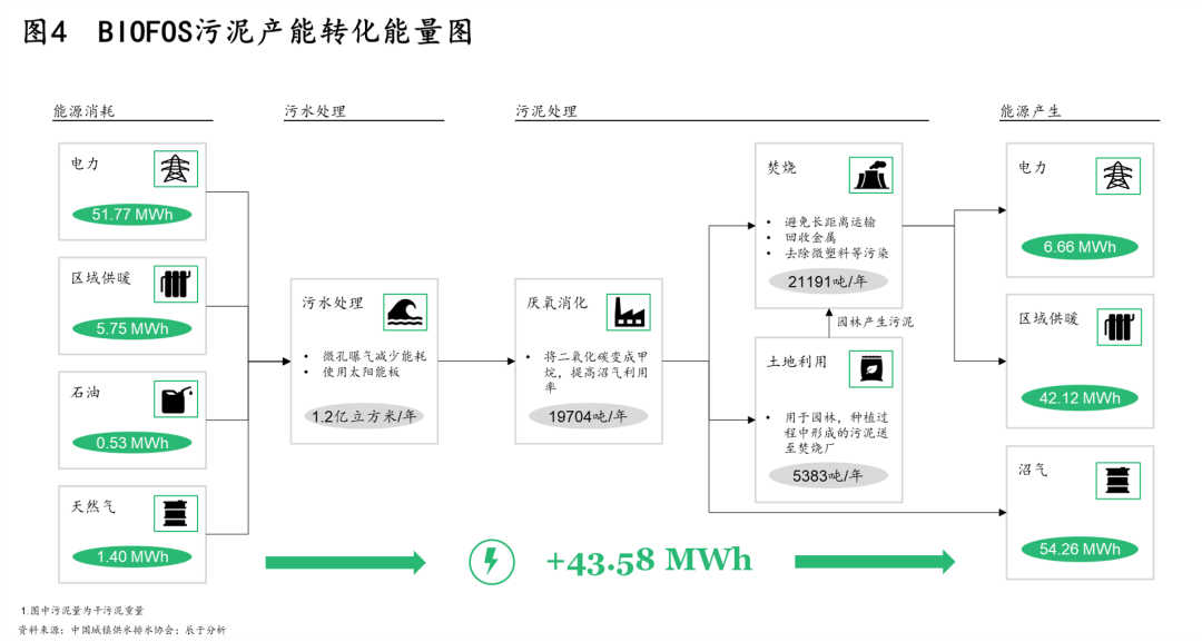 其二,30●60雙碳目標提出后,未來污泥處理處置將以節(jié)能降耗及能源資源回收為目標,這對污泥處理提出了更為清晰的技術(shù)路徑方向。例如在能源回收上,厭氧消化是優(yōu)選途徑,如丹麥污水廠BIOFOS通過污泥消化產(chǎn)能實現(xiàn)能量盈余(見圖4)。