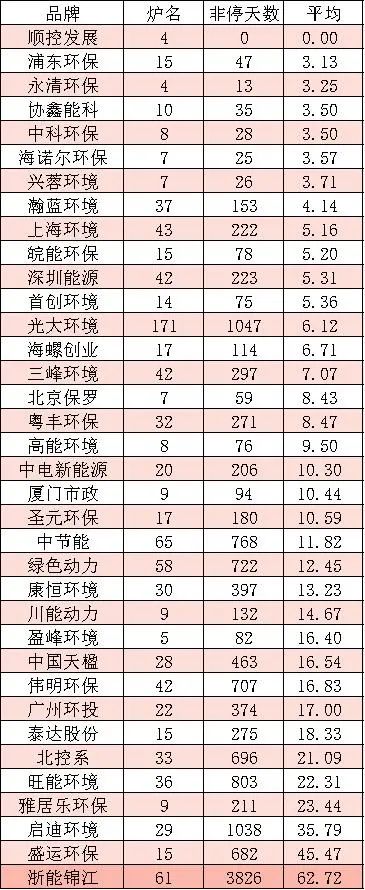此榜單主要是衡量不同品牌旗下焚燒爐,每次非計劃停爐的平均時長,主要是與衡量故障大小狀況有關,如果導致非停的故障較大,就必然要延長檢修時間。