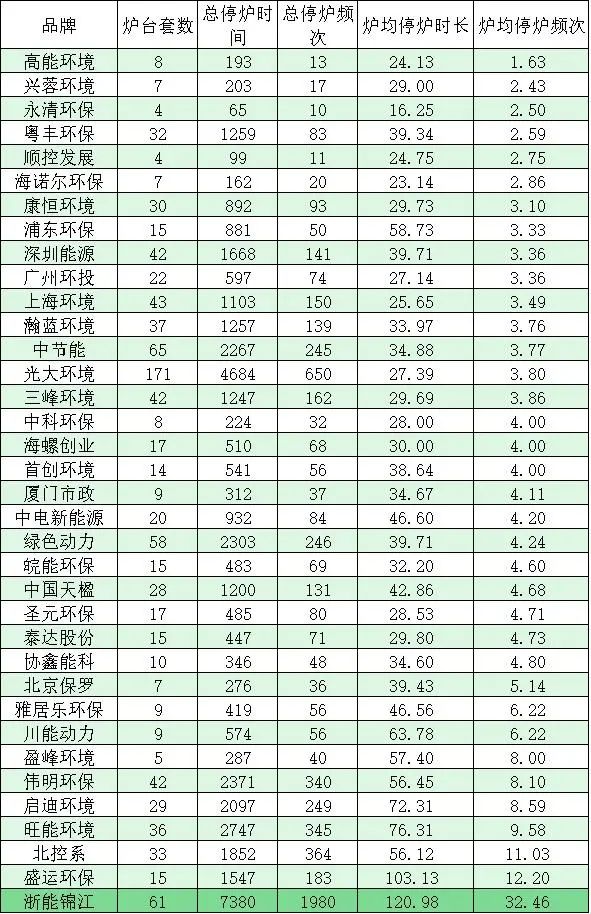 康恒環(huán)境、浦東環(huán)保、深圳能源、廣州環(huán)投、上海環(huán)境、瀚藍環(huán)境、中節(jié)能、光大環(huán)境、三峰環(huán)境、中科環(huán)保、海螺創(chuàng)業(yè)、首創(chuàng)環(huán)境等12家國內垃圾焚燒頭部和知名企業(yè),平均爐均總停爐頻次則小于或等于4次。