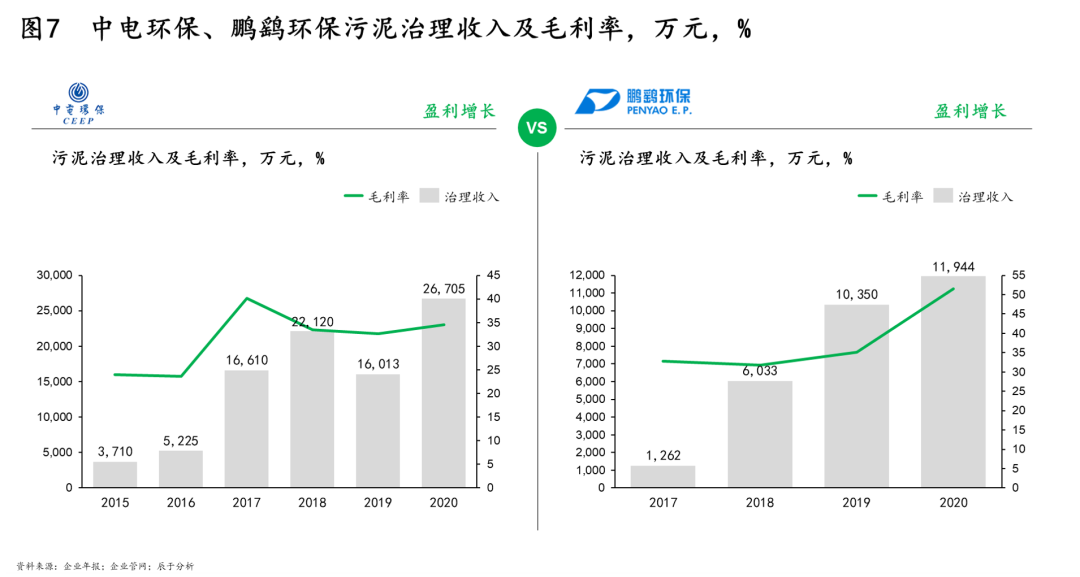 即便如此,我們也看到了部分盈利表現(xiàn)優(yōu)良的企業(yè),如中電環(huán)保和鵬鷂環(huán)保,兩者的污泥處理營收和毛利率在近年來均呈現(xiàn)不同程度的增長(見圖7)。