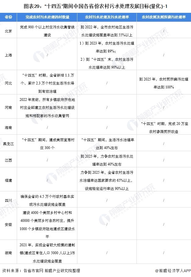 在“十四五”開年之際,全國31個(gè)省(市、自治區(qū))在《“十四五”規(guī)劃》中均提到要穩(wěn)步推進(jìn)農(nóng)村污水處理。北京、上海、河北多地提出了量化的目標(biāo)規(guī)劃,如上海提出了到“十四五”末,農(nóng)村生活污水處理率達(dá)到90%以上。其它省份農(nóng)村污水處理行業(yè)發(fā)展量化目標(biāo)如下: