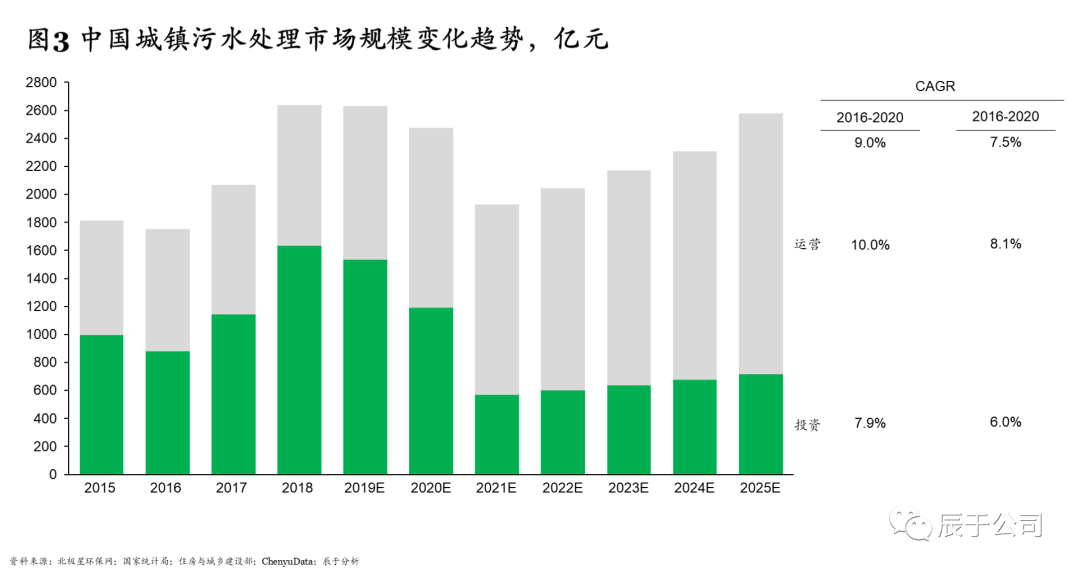 “重建設(shè)輕運(yùn)營”一直是制約我國污水處理市場發(fā)展的主要因素之一,展望“十四五”,我們認(rèn)為這一問題將進(jìn)一步改觀,運(yùn)營將逐步成為核心。據(jù)辰于測算,“十四五”期間全國污水處理市場每年的投資額將維持在500~750億元之間,而運(yùn)營則將保持8.1%的年復(fù)合增速,到2025年達(dá)到1860億元的收入規(guī)模(見圖3)。
