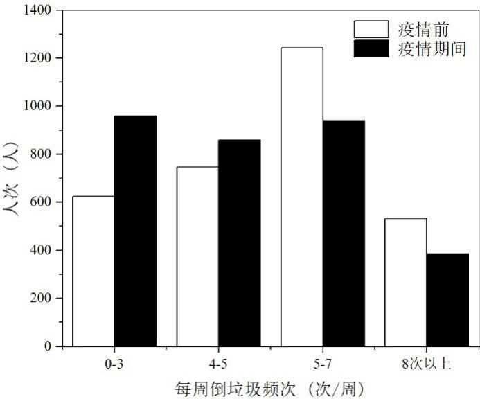 疫情導(dǎo)致社區(qū)垃圾分類基礎(chǔ)成分產(chǎn)生明顯變化,廢棄口罩大量增加,居民投放垃圾頻次顯著降低。疫情期間,人均廢棄口罩產(chǎn)生頻次約為3.7個/周,將近一半(48.2%)被調(diào)查者平均每周產(chǎn)生廢棄口罩數(shù)量在0~3個范圍;30.6%居民投放垃圾頻率降低,由疫情前5~7次向疫情期間低頻段轉(zhuǎn)變趨勢明顯,疫情越嚴重地區(qū)口罩產(chǎn)頻更高、投放垃圾頻率降低更多。針對垃圾組分變化,社區(qū)應(yīng)貫徹落實垃圾分類,對涉疫垃圾分類分流收集處置,并靈活調(diào)整疫情期間垃圾清運計劃,總結(jié)居民行為規(guī)律,適時調(diào)減清運頻次降低成本。