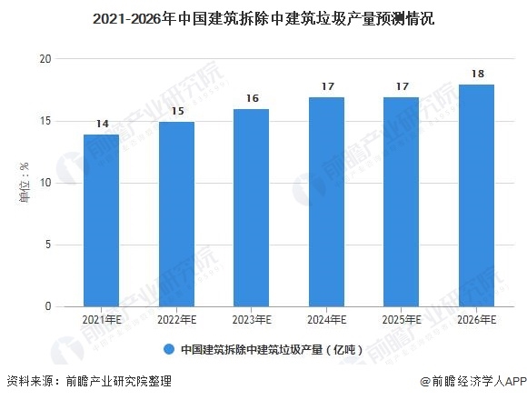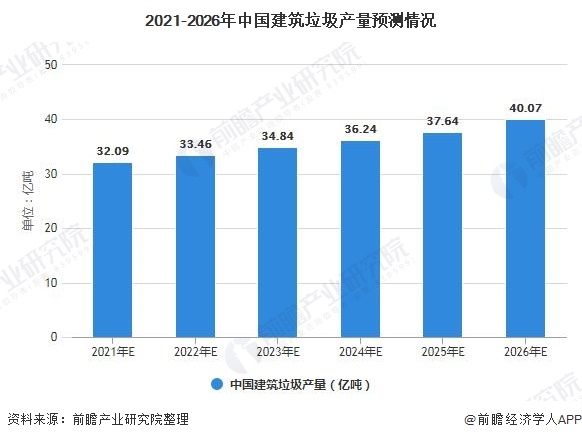 前瞻根據(jù)初步預(yù)測到2021年我國需要處理的建筑垃圾產(chǎn)量將達到32.09億噸,2026年,產(chǎn)量有望突破40億噸;若以35元/噸(運輸費與處置費)計算,預(yù)計2021年建筑垃圾處理市場規(guī)模將超過1400億元。