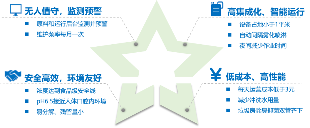 測的準是后續(xù)防控的基礎,而溯源工作是關鍵支撐,尤其是園區(qū)的惡臭溯源。首先通過現(xiàn)場勘查園區(qū)的污染情況進行摸底,建立園區(qū)“一企一檔”;其次在園區(qū)敏感點或企業(yè)邊界布設監(jiān)測站,建立園區(qū)立體監(jiān)測網;此外通過便攜式在線監(jiān)測設備開展走航觀測,確定重污染區(qū)域。通過構建溯源模型,對監(jiān)測子站的數(shù)據(jù)、園區(qū)地形地貌、企業(yè)基礎信息等進行匹配和計算,初判預警數(shù)據(jù)的排放源。針對園區(qū)內各污染因子設定對應的預警閾值,構建園區(qū)多級預警體系,自動觸發(fā)大氣污染溯源系統(tǒng),形成“監(jiān)測組網-預測預警-溯源管控”的問題閉環(huán)。未來在源頭除臭方面,自動化除臭裝備也有較大的發(fā)展空間。其中以次氯酸水為代表,一方面其具有強勁的氧化能力,能真正分解惡臭污染物氣體分子。此外能迅速摧毀吸附于細胞膜表面上的病毒蛋白質成分,使其無法再傳染病菌。惡臭監(jiān)測與控制“標準+α”優(yōu)化方案