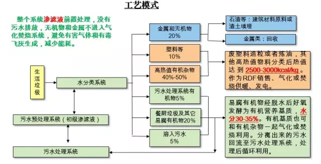 以自有研發(fā)的垃圾水分類技術(shù)為核心和前提,結(jié)合并優(yōu)化現(xiàn)有垃圾分類方法、資源再生技術(shù)的垃圾處理方法,整個(gè)系統(tǒng)滲濾液前置處理,沒有污水排放,無(wú)機(jī)物和金屬不進(jìn)入氣化焚燒系統(tǒng),避免有害氣體和有毒飛灰生成,減少能耗。以其恩施項(xiàng)目為典型案例,對(duì)其具有自主專利的垃圾水分類技術(shù)進(jìn)行了全面的介紹,具有綜合利用率80%以上,無(wú)二次污染,清洗水全部經(jīng)處理回用,氣化燃?xì)夂蜔煔馀欧胚_(dá)標(biāo)無(wú)隱患等技術(shù)特點(diǎn)。