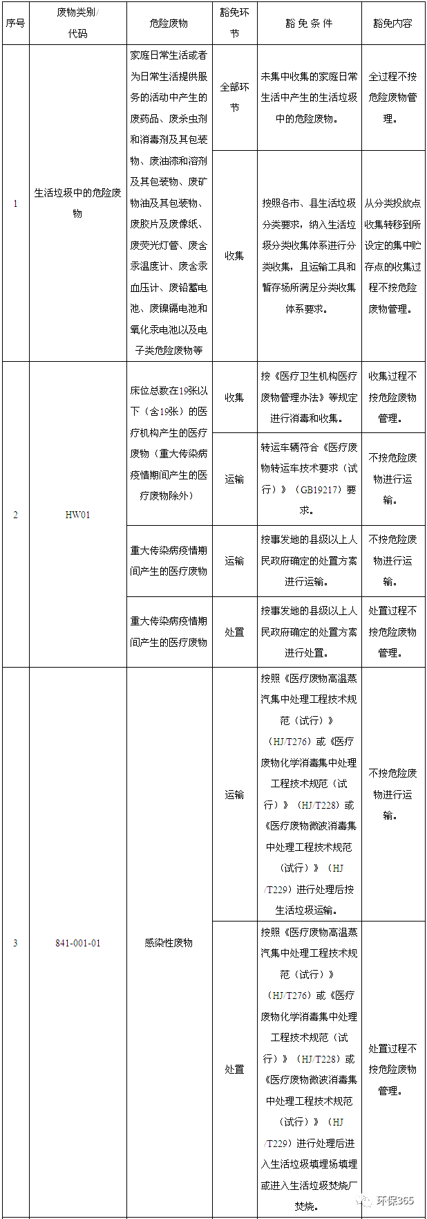 (1)家庭日常生活或者為日常生活提供服務(wù)的活動(dòng)中產(chǎn)生的廢藥品、廢殺蟲劑和消毒劑及其包裝物、廢油漆和溶劑及其包裝物、廢礦物油及其包裝物、廢膠片及廢像紙、廢熒光燈管、廢含汞溫度計(jì)、廢含汞血壓計(jì)、廢鉛蓄電池、廢鎳鎘電池和氧化汞電池以及電子類危險(xiǎn)廢物等未經(jīng)過(guò)集中收集的全部環(huán)節(jié)不按危險(xiǎn)廢物管理;按照各市、縣生活垃圾分類要求,納入生活垃圾分類收集體系進(jìn)行分類收集,且運(yùn)輸工具和暫存場(chǎng)所滿足分類收集體系要求的,從分類投放點(diǎn)收集轉(zhuǎn)移到所設(shè)定的集中貯存點(diǎn)的收集過(guò)程不按危險(xiǎn)廢物管理。(2)床位總數(shù)在19張以下(含19張)的醫(yī)療機(jī)構(gòu)產(chǎn)生的醫(yī)療廢物(重大傳染病疫情期間產(chǎn)生的醫(yī)療廢物除外)按《醫(yī)療衛(wèi)生機(jī)構(gòu)醫(yī)療廢物管理辦法》等規(guī)定進(jìn)行消毒和收集的,收集過(guò)程不按危險(xiǎn)廢物管理;轉(zhuǎn)運(yùn)車輛符合《醫(yī)療廢物轉(zhuǎn)運(yùn)車技術(shù)要求(試行)》(GB19217)要求的,不按危險(xiǎn)廢物進(jìn)行運(yùn)輸;重大傳染病疫情期間產(chǎn)生的醫(yī)療廢物,按事發(fā)地的縣級(jí)以上人民政府確定的處置方案進(jìn)行運(yùn)輸?shù)?,不按危險(xiǎn)廢物進(jìn)行運(yùn)輸;按事發(fā)地的縣級(jí)以上人民政府確定的處置方案進(jìn)行處置的,處置過(guò)程不按危險(xiǎn)廢物管理。(3)感染性廢物按照《醫(yī)療廢物高溫蒸汽集中處理工程技術(shù)規(guī)范(試行)》(HJ/T276)或《醫(yī)療廢物化學(xué)消毒集中處理工程技術(shù)規(guī)范(試行)》(HJ/T228)或《醫(yī)療廢物微波消毒集中處理工程技術(shù)規(guī)范(試行)》(HJ/T229)進(jìn)行處理后按生活垃圾運(yùn)輸?shù)?,不按危險(xiǎn)廢物進(jìn)行運(yùn)輸;按照《醫(yī)療廢物高溫蒸汽集中處理工程技術(shù)規(guī)范(試行)》(HJ/T276)或《醫(yī)療廢物化學(xué)消毒集中處理工程技術(shù)規(guī)范(試行)》(HJ/T228)或《醫(yī)療廢物微波消毒集中處理工程技術(shù)規(guī)范(試行)》(HJ/T229)進(jìn)行處理后進(jìn)入生活垃圾填埋場(chǎng)填埋或進(jìn)入生活垃圾焚燒廠焚燒的,處置過(guò)程不按危險(xiǎn)廢物管理。(4)損傷性廢物按照《醫(yī)療廢物高溫蒸汽集中處理工程技術(shù)規(guī)范(試行)》(HJ/T276)或《醫(yī)療廢物化學(xué)消毒集中處理工程技術(shù)規(guī)范(試行)》(HJ/T228)或《醫(yī)療廢物微波消毒集中處理工程技術(shù)規(guī)范(試行)》(HJ/T229)進(jìn)行處理后按生活垃圾運(yùn)輸?shù)?,不按危險(xiǎn)廢物進(jìn)行運(yùn)輸;按照《醫(yī)療廢物高溫蒸汽集中處理工程技術(shù)規(guī)范(試行)》(HJ/T276)或《醫(yī)療廢物化學(xué)消毒集中處理工程技術(shù)規(guī)范(試行)》(HJ/T228)或《醫(yī)療廢物微波消毒集中處理工程技術(shù)規(guī)范(試行)》(HJ/T229)進(jìn)行處理后進(jìn)入生活垃圾填埋場(chǎng)填埋或進(jìn)入生活垃圾焚燒廠焚燒的,處置過(guò)程不按危險(xiǎn)廢物管理。(5)病理性廢物(人體器官除外)按照《醫(yī)療廢物化學(xué)消毒集中處理工程技術(shù)規(guī)范(試行)》(HJ/T228)或《醫(yī)療廢物微波消毒集中處理工程技術(shù)規(guī)范(試行)》(HJ/T229)進(jìn)行處理后按生活垃圾運(yùn)輸?shù)?,不按危險(xiǎn)廢物進(jìn)行運(yùn)輸;按照《醫(yī)療廢物化學(xué)消毒集中處理工程技術(shù)規(guī)范(試行)》(HJ/T228)或《醫(yī)療廢物微波消毒集中處理工程技術(shù)規(guī)范(試行)》(HJ/T229)進(jìn)行處理后進(jìn)入生活垃圾焚燒廠焚燒的,處置過(guò)程不按危險(xiǎn)廢物管理。(6)農(nóng)藥使用后被廢棄的與農(nóng)藥直接接觸或含有農(nóng)藥殘余物的包裝物依據(jù)《農(nóng)藥包裝廢棄物回收處理管理辦法》收集并轉(zhuǎn)移到所設(shè)定的集中貯存點(diǎn)的,收集過(guò)程不按危險(xiǎn)廢物管理;滿足《農(nóng)藥包裝廢棄物回收處理管理辦法》中的運(yùn)輸要求的,不按危險(xiǎn)廢物進(jìn)行運(yùn)輸;進(jìn)入依據(jù)《農(nóng)藥包裝廢棄物回收處理管理辦法》確定的資源化利用單位進(jìn)行資源化利用的,利用過(guò)程不按危險(xiǎn)廢物管理;進(jìn)入生活垃圾填埋場(chǎng)填埋或進(jìn)入生活垃圾焚燒廠焚燒的,處置過(guò)程不按危險(xiǎn)廢物管理。(7)船舶含油污水及殘油經(jīng)船上或港口配套設(shè)施預(yù)處理后產(chǎn)生的需通過(guò)船舶轉(zhuǎn)移的廢礦物油與含礦物油廢物按照水運(yùn)污染危害性貨物實(shí)施管理的,不按危險(xiǎn)廢物進(jìn)行運(yùn)輸。(8)廢鐵質(zhì)油桶(不包括900-041-49類)封口處于打開狀態(tài)、靜置無(wú)滴漏且經(jīng)打包壓塊后用于金屬冶煉的,利用過(guò)程不按危險(xiǎn)廢物管理。(9)金屬制品機(jī)械加工行業(yè)珩磨、研磨、打磨過(guò)程,以及使用切削油或切削液進(jìn)行機(jī)械加工過(guò)程中產(chǎn)生的屬于危險(xiǎn)廢物的含油金屬屑經(jīng)壓榨、壓濾、過(guò)濾除油達(dá)到靜置無(wú)滴漏后打包壓塊用于金屬冶煉的,利用過(guò)程不按危險(xiǎn)廢物管理。(10)煤炭焦化、氣化及生產(chǎn)燃?xì)膺^(guò)程中產(chǎn)生的滿足《煤焦油標(biāo)準(zhǔn)》(YB/T5075)技術(shù)要求的高溫煤焦油作為原料深加工制取萘、洗油