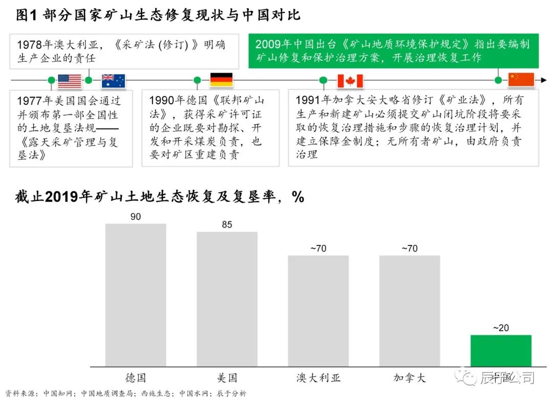 自《礦山地質(zhì)環(huán)境保護(hù)規(guī)定》2009年5月1日施行以來(lái),我國(guó)才正式將礦山生態(tài)修復(fù)和保護(hù)治理工作提上日程,相比美國(guó)、澳大利亞、德國(guó)、加拿大等發(fā)達(dá)國(guó)家,我國(guó)礦山生態(tài)修復(fù)的起步時(shí)間晚了20~30年,也正因?yàn)榇?,截?019年底,這些歐美國(guó)家累計(jì)礦山生態(tài)恢復(fù)及復(fù)墾率普遍高于70%,而中國(guó)僅為20%左右(見(jiàn)圖1)。
