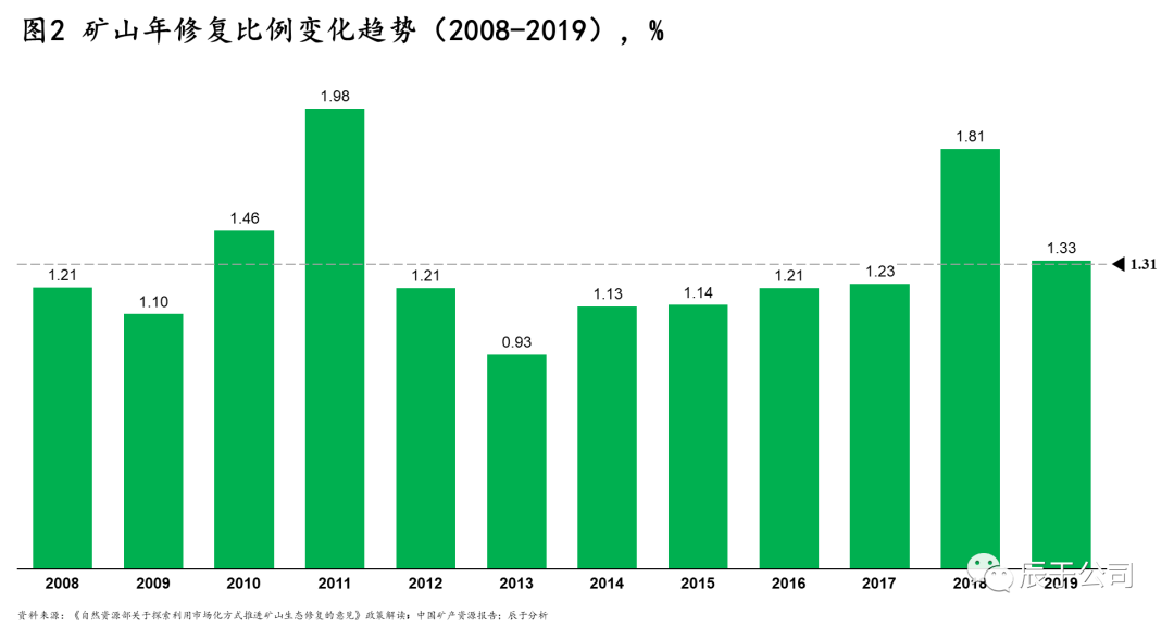 然而,這一巨大潛在市場(chǎng)空間尚未有效釋放,過(guò)去10年我國(guó)每年礦山生態(tài)修復(fù)面積的比例均不高于2%(見(jiàn)圖2),礦山生態(tài)修復(fù)形勢(shì)并不樂(lè)觀。