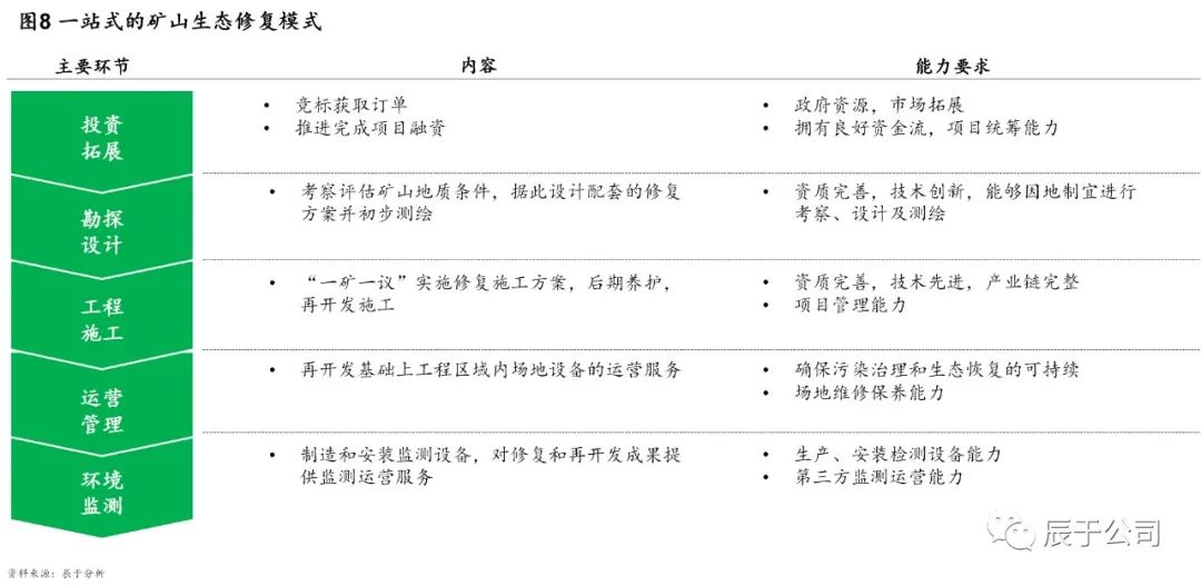 參考國(guó)際成熟經(jīng)驗(yàn),我們認(rèn)為未來(lái)EPC仍然是主流模式。不過(guò)隨著推進(jìn)大礦山生態(tài)修復(fù)勢(shì)在必行,預(yù)計(jì)PPP項(xiàng)目數(shù)量將有所增加,尤其是遼寧、河南、山東、內(nèi)蒙古等礦山生態(tài)修復(fù)走在前列的省份值得關(guān)注。當(dāng)然,這對(duì)入局企業(yè)也提出了更高要求,他們不僅要有較強(qiáng)的政府資源和市場(chǎng)拓展能力,還要關(guān)注礦山生態(tài)修復(fù)多環(huán)節(jié)的打通,提升諸如生態(tài)環(huán)境考察評(píng)估、破壞診斷、方案設(shè)計(jì)、修復(fù)系統(tǒng)構(gòu)造、生態(tài)景觀建設(shè)、系統(tǒng)跟蹤與維護(hù)、環(huán)境監(jiān)測(cè)等各項(xiàng)能力,打造一站式整體修復(fù)模式(見(jiàn)圖7)。