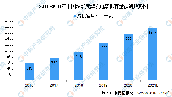 數(shù)據(jù)顯示,我國(guó)垃圾焚燒發(fā)電裝機(jī)容量由2016年549萬千瓦增至2020年1533萬千瓦,年均復(fù)合增長(zhǎng)率為29.27%。中商產(chǎn)業(yè)研究院預(yù)測(cè),2021年垃圾焚燒發(fā)電裝機(jī)容量可達(dá)1729萬千瓦。