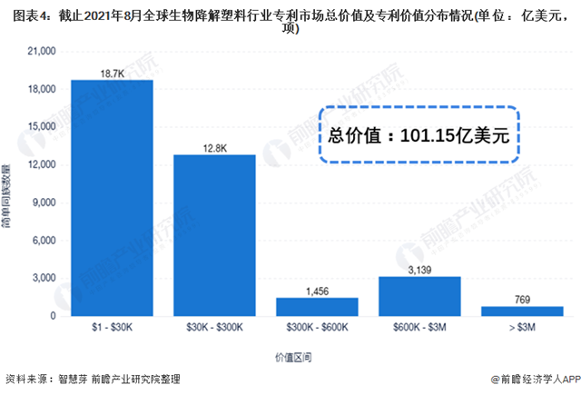 目前,全球生物降解塑料行業(yè)專利總價值為100.79億美元。其中,3萬美元以下的生物降解塑料專利申請數(shù)量最多,為18735項;其次是3萬-30萬美元的生物降解塑料專利,合計專利申請量為12812項。3百萬美元以上的生物降解塑料專利申請數(shù)量最少,為769項。