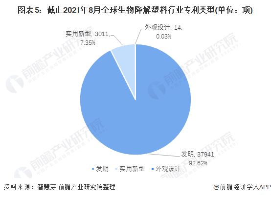 在專利類型方面,目前全球有37941項生物降解塑料專利為發(fā)明專利,占全球生物降解塑料專利申請數(shù)量最多,為92.62%。實用新型生物降解塑料專利和外觀設(shè)計型生物降解塑料專利數(shù)量分別為3011和14,分別占全球生物降解塑料專利申請數(shù)量的7.35%和0.03%。