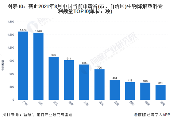 中國方面,廣東為中國當(dāng)前申請生物降解塑料專利數(shù)量最多的省份,累計當(dāng)前生物降解塑料專利申請數(shù)量高達1574項。廣東和江蘇當(dāng)前申請生物降解塑料專利數(shù)量均超過1500項。中國當(dāng)前申請省(市、自治區(qū))生物降解塑料專利數(shù)量排名前十的省份還有浙江、北京、上海、山東、安徽、四川、福建、湖南。