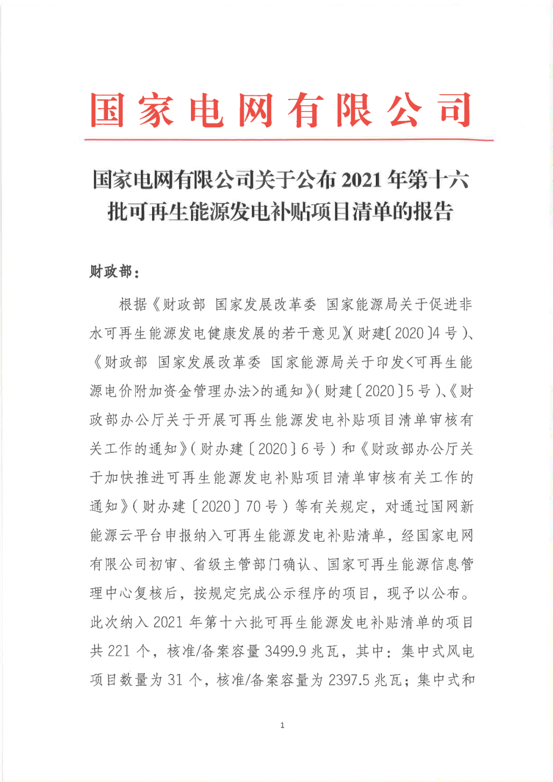 關(guān)于公布2021年第十六批可再生能源發(fā)電補貼項目清單的公告