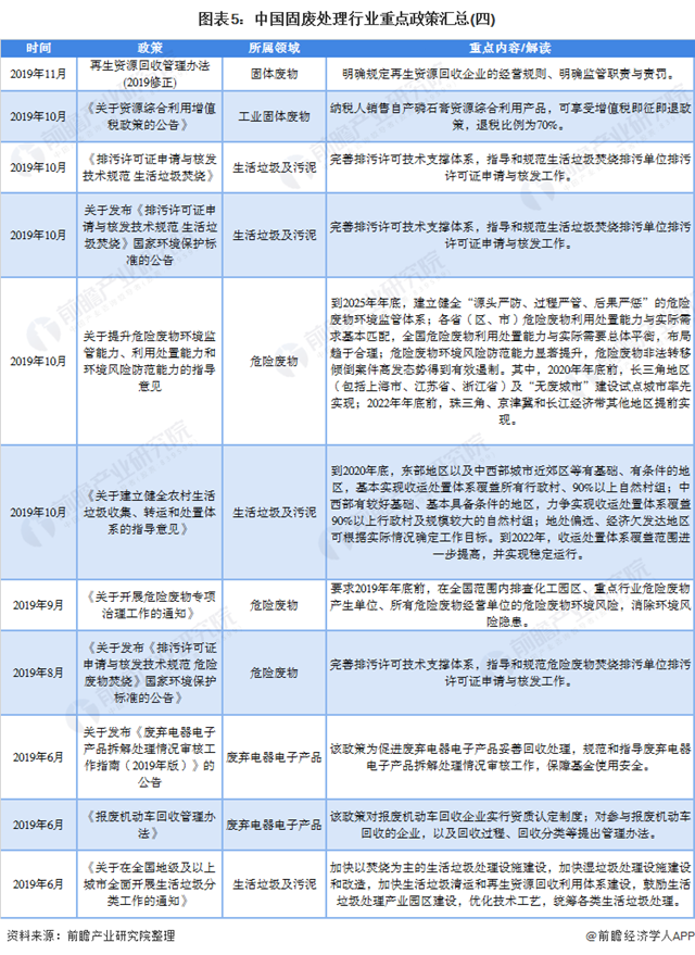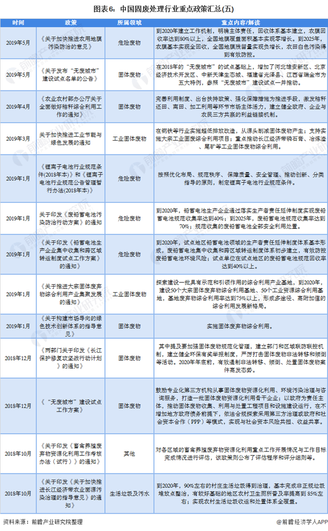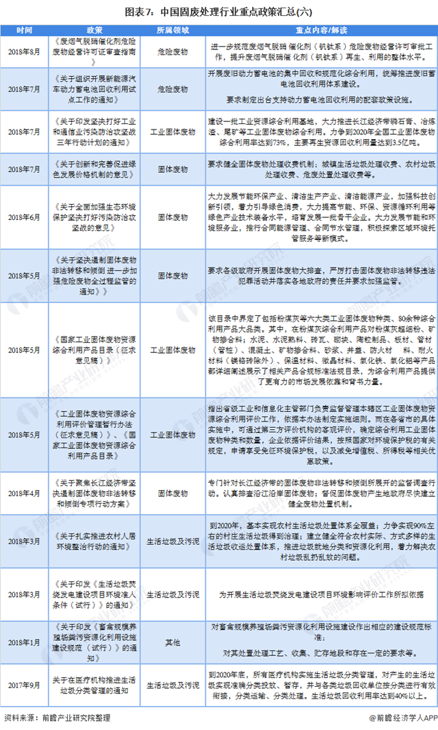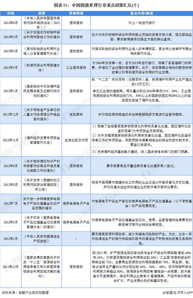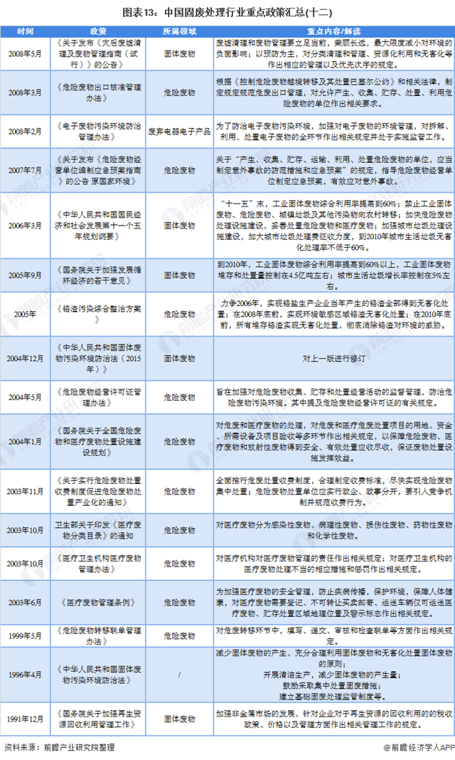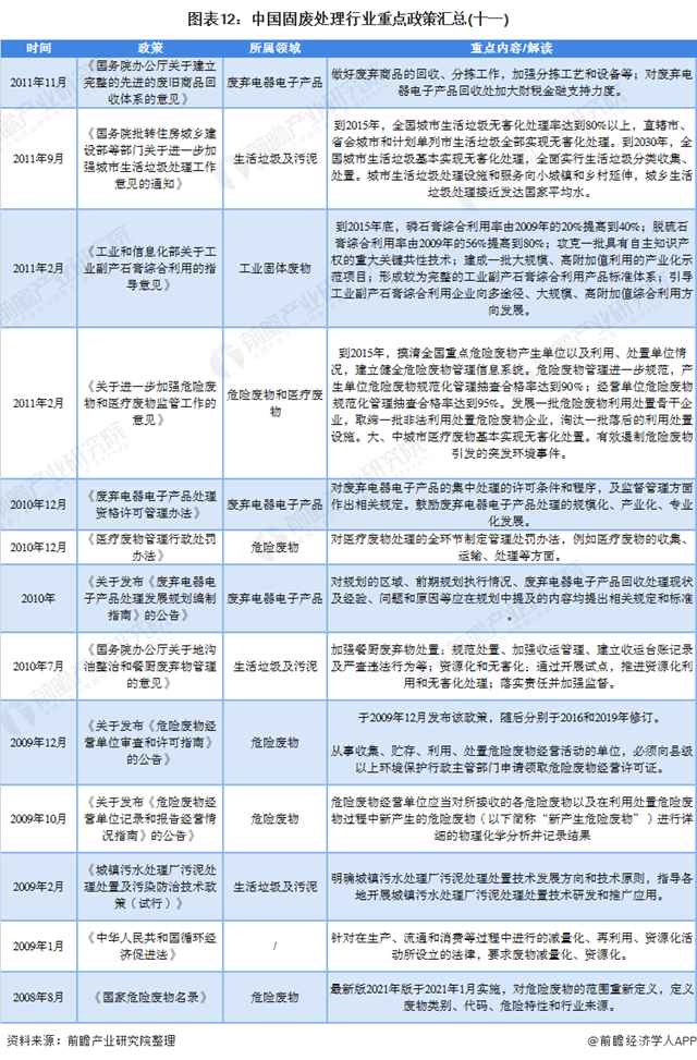我國固廢行業(yè)相關的重點政策針對方面主要可分為綜合固體廢物、危險廢物、工業(yè)固體廢物、廢棄電器電子產(chǎn)品、生活垃圾及污泥及其他,在該基礎上,針對不同方面出臺了數(shù)量相當?shù)恼咭砸?guī)定和支持固廢處理及其相關產(chǎn)業(yè)(例如,垃圾焚燒發(fā)電等)的產(chǎn)業(yè)化發(fā)展。