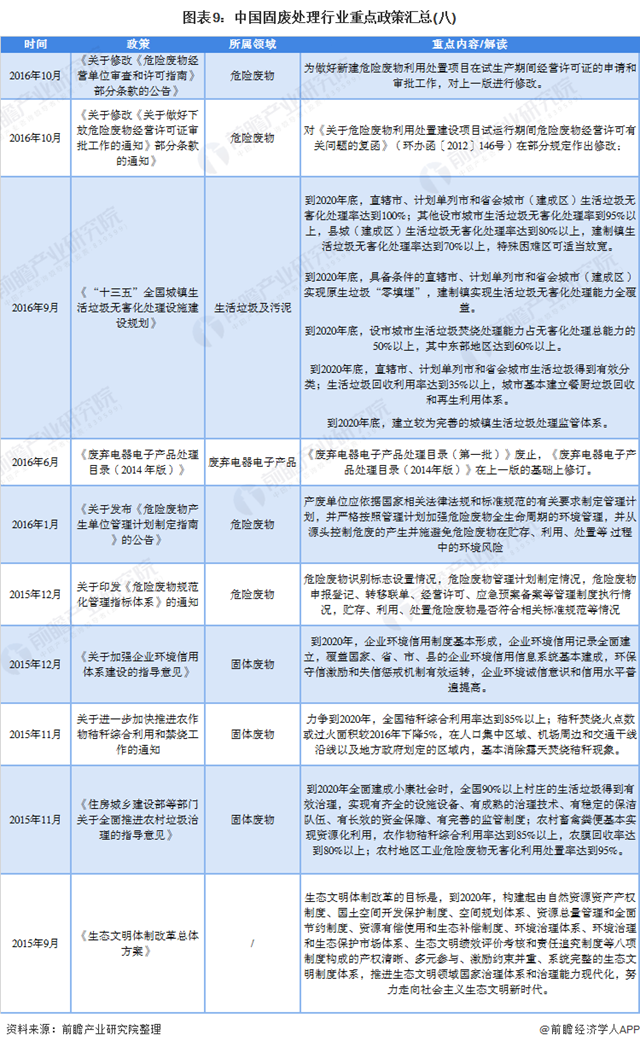 從“八五”規(guī)劃開始,我國就在國家層面戰(zhàn)略中不斷對固廢處理的概念和規(guī)劃進行優(yōu)化。從“八五”的普遍固體廢物綜合利用的概念,到“九五”出現(xiàn)生活垃圾無害化處理, “十五”的危險廢物集中處理,“十一五”的醫(yī)療廢物、廢棄電子產(chǎn)品和秸稈、農(nóng)膜、禽畜糞便等其他固體廢物,“十三五”的餐廚垃圾和建筑垃圾等一系列新的固廢概念的出現(xiàn)和分類標準的變更,給我國的固廢處理行業(yè)帶來了新的機遇與更高要求的政策標準。