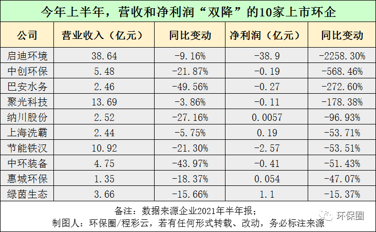 也就是說(shuō),今年上半年,111家上市環(huán)企中,無(wú)論是營(yíng)業(yè)收入,還是歸母凈利潤(rùn)方面,大家都表現(xiàn)得不錯(cuò),一掃2020年的悲觀情緒,70%以上的環(huán)保企業(yè)都向股東和市場(chǎng)交付了一張靚麗的答卷,實(shí)現(xiàn)了“后疫情時(shí)代”的強(qiáng)勢(shì)反彈。具體到個(gè)股,絕大多數(shù)企業(yè)也都在今年上半年開(kāi)了個(gè)好頭,經(jīng)營(yíng)業(yè)績(jī)打了個(gè)漂亮“翻身仗”。有的一改往日業(yè)績(jī)頹勢(shì),歸母凈利潤(rùn)實(shí)現(xiàn)百分之幾千增長(zhǎng),如雪浪環(huán)境,城發(fā)環(huán)境、雪迪龍;也有的逐步擺脫虧損帽子,歸母凈利潤(rùn)實(shí)現(xiàn)百分之幾百的大增,如中金環(huán)境、嶺南股份、蒙草生態(tài)、津膜科技、菲達(dá)環(huán)保等;還有的細(xì)分領(lǐng)域龍頭,如上文提到格林美、碧水源、清新環(huán)境,也從去年疫情和產(chǎn)業(yè)寒冬的陣痛中慢慢地企穩(wěn)、好轉(zhuǎn),重現(xiàn)往日輝煌。歷經(jīng)了金融領(lǐng)域去杠桿、PPP政策強(qiáng)監(jiān)管、新冠肺炎疫情沖擊以及民企易主“混改潮”后,這些上市環(huán)企雖然有過(guò)迷茫,有過(guò)失敗,有過(guò)反思,但最終還是重拾信心,不屈不撓,終于迎來(lái)了業(yè)績(jī)復(fù)蘇。不過(guò),今年上半年,在業(yè)績(jī)普遍好轉(zhuǎn)的背景下,依然還是有個(gè)別環(huán)保企業(yè)“不爭(zhēng)氣”,表現(xiàn)差強(qiáng)人意,比如啟迪環(huán)境、巴安水務(wù)、節(jié)能國(guó)禎、聚光科技、中環(huán)裝備等10家企業(yè)(如圖三所示),營(yíng)收和凈利潤(rùn)雙雙下滑,甚至有的企業(yè)較上年同期,虧損幅度擴(kuò)大化,前景堪憂。圖三:今年上半年,營(yíng)收和凈利潤(rùn)“雙降”的10家上市環(huán)企▼