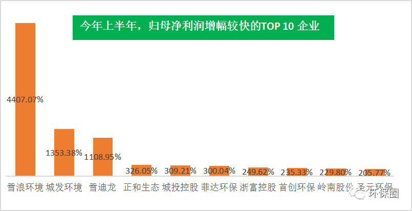 營(yíng)收變動(dòng)幅度方面,數(shù)據(jù)同樣喜人。111家上市環(huán)企,除了那些穩(wěn)步連續(xù)增長(zhǎng)“卓越者”,每年總有一些讓人意想不到的“黑馬”企業(yè)率先突圍出來(lái),少則百分之幾百增長(zhǎng),多則百分之上千增長(zhǎng),成為上半年?duì)I收增速最快的10家先鋒企業(yè)。在半年度營(yíng)收增速TOP10中,既有坐落于上海的房產(chǎn)/水務(wù)/固廢“三劍齊發(fā)”的城投控股以及旗下的上海環(huán)境,也有因納入電價(jià)補(bǔ)貼、部分焚燒項(xiàng)目轉(zhuǎn)運(yùn)營(yíng)推動(dòng)業(yè)績(jī)大增的城發(fā)環(huán)境和圣元環(huán)保,亦有去年業(yè)績(jī)還萎靡不振的萬(wàn)邦達(dá)和東方園林(如圖六所示)。圖六:半年度營(yíng)收增速較快的TOP10榜單▼