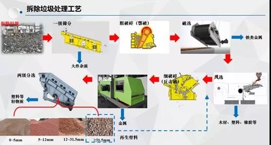 拆除垃圾的處理工藝,確定為“兩級(jí)破碎+兩級(jí)篩分+兩級(jí)風(fēng)選”。先經(jīng)過(guò)一級(jí)篩分設(shè)備將大件雜質(zhì)去掉,然后經(jīng)過(guò)第一級(jí)粗破碎——鄂破,再用磁選,把鐵類金屬選出來(lái),然后進(jìn)行風(fēng)選,把木材、塑料、橡膠等物質(zhì)篩出來(lái)。之后進(jìn)入二破——反擊破,再通過(guò)渦電流分選,把非鐵類金屬選出來(lái),接下來(lái)進(jìn)行兩級(jí)篩分及風(fēng)選,分出再生骨料,可以結(jié)合后端利用途徑,分成不同粒徑集配的骨料。