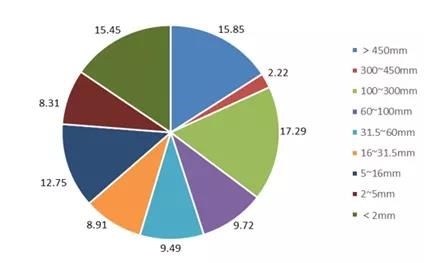 從不同粒徑角度,來(lái)分析拆除垃圾和裝修垃圾,可以看出,兩類垃圾的粒徑范圍比較大。其中粒徑大于450mm的大塊物料以及小于2mm的粉狀物料占比相對(duì)較多,這兩類物料加起來(lái)超過(guò)了三分之一。