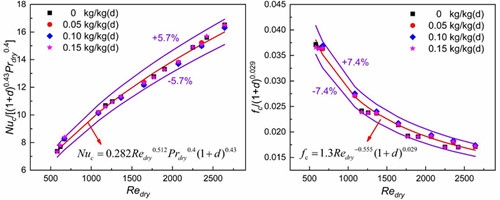 濕工質(zhì)中的含濕量顯著影響微通道回?zé)崞鞯膿Q熱性能,為了分析含濕量的定量影響,研究人員構(gòu)建了翼型-直通道新型耦合流動(dòng)換熱單元三維數(shù)理模型,討論了含濕量、流量和溫度等因素對(duì)耦合換熱的影響規(guī)律,對(duì)比了翼型結(jié)構(gòu)與直通道、之字形結(jié)構(gòu)的綜合流動(dòng)換熱性能。研究表明,增加含濕量可以提高高壓空氣的整體流動(dòng)換熱特性;在等泵功的條件下,交錯(cuò)排列的翼型翅片相比較于直通道和之字形通道具有最好的熱工水力特性?;诟晒べ|(zhì)經(jīng)驗(yàn)關(guān)聯(lián)式,引入含濕量強(qiáng)化換熱因子,建立了高溫含濕煙氣和高壓濕空氣流動(dòng)換熱特性與含濕量的定量關(guān)聯(lián)式,定量描述了含濕量對(duì)傳熱和壓降特性的影響規(guī)律(見圖2)。