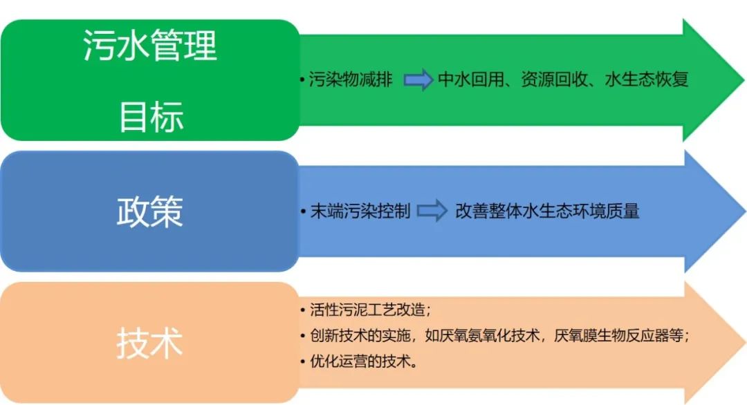 近幾十年來,中國污水行業(yè)經(jīng)歷了高速增長,在基礎(chǔ)設(shè)施建設(shè)、技術(shù)創(chuàng)新、人才培養(yǎng)等方面取得了進(jìn)步,為未來的智慧化、低碳化、資源化發(fā)展奠定了堅(jiān)實(shí)的基礎(chǔ)。然而,未來仍然充滿不確定性和挑戰(zhàn)。預(yù)計(jì)隨著人口的持續(xù)增長和城市化進(jìn)程,水資源短缺將更加嚴(yán)重,而污水量將進(jìn)一步增加。這將要求污水管理目標(biāo)、政策和技術(shù)發(fā)生根本性變化,如下圖: