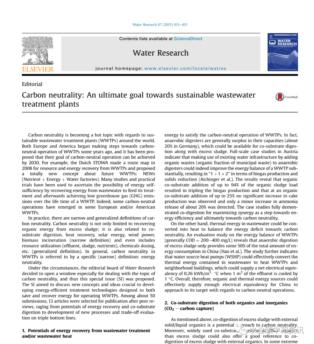 在這種環(huán)境下,《Water Research》編輯委員會決定開辟以專研究碳中和為主題的窗口,特推出本期特刊。本刊旨在為開發(fā)高效能源處理技術,探討新理念和觀點,旨在污水處理廠運行節(jié)能與能源回收。從約50份投稿論文中,經同行評審最后錄用其中13篇文章,內容涵蓋了從能源回收與有機質共消化到新工藝與設計方法開發(fā),再到量化和指導可持續(xù)性工藝發(fā)展等多個角度。