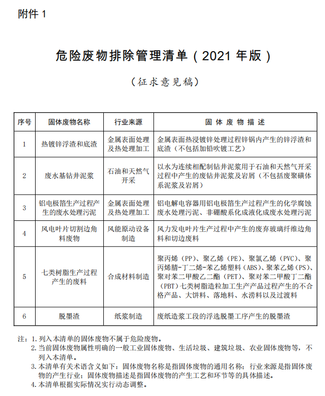 附件:1.危險(xiǎn)廢物排除管理清單(2021年版)(征求意見稿)
