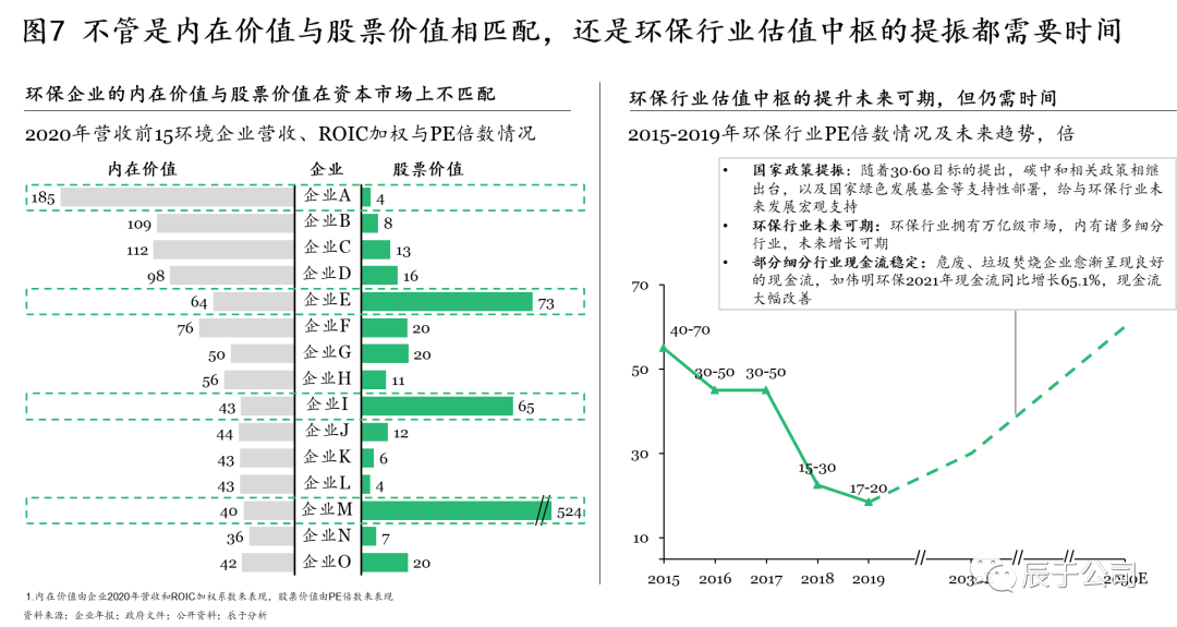 但必須承認(rèn)的是,向好趨勢的背后,我國資本市場的制度完善仍需時間。首先是生態(tài)環(huán)保企業(yè)內(nèi)在價值與股票價值的相匹配需要時間,在對生態(tài)環(huán)保企業(yè)2020年營收前15強的營收、ROIC加權(quán)和PE倍數(shù)進(jìn)行分析得到,多數(shù)企業(yè)(如企業(yè)A、E、I、M)的內(nèi)在價值與股票價值在資本市場上并不匹配。其次是生態(tài)環(huán)保估值中樞的提升仍需時日,盡管隨著國家政策的提振、生態(tài)環(huán)保行業(yè)的發(fā)展、部分細(xì)分行業(yè)企業(yè)現(xiàn)金流狀況的改善,環(huán)保估值中樞提升未來可期,但也并不是一蹴而就的(見圖7)。