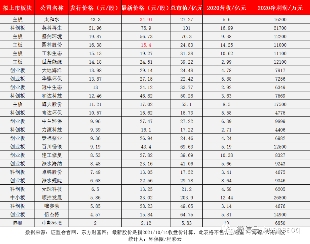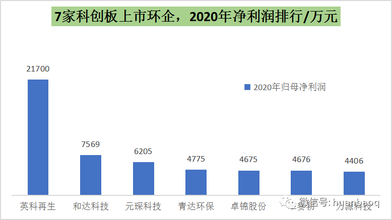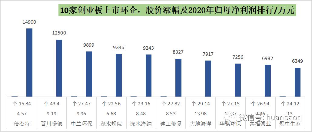 接下來,再說說大家比較關(guān)心的,今年上市企業(yè)的股價(jià)漲幅、最新市值和盈利水平。我們選擇主板、創(chuàng)業(yè)板、科創(chuàng)板上市的企業(yè)分別進(jìn)行對比。今年在主板上市的共有7家企業(yè),分別為太和水、園林股份、海天股份、盛劍環(huán)境、世茂能源、正和生態(tài)和宇通重工,由于宇通重工是通過大股東摘帽變更方式上市而來,暫且不對其進(jìn)行評價(jià)。剩下6家企業(yè)中,根據(jù)10月14日的收盤價(jià),太和水和園林股份竟然跌破發(fā)行價(jià),尤其是太和水,從發(fā)行價(jià)的43.3元/股跌至34.91元/股,總市值蒸發(fā)了近14億元。而同為主板上市的盛劍環(huán)境則表現(xiàn)極佳,這家從事半導(dǎo)體廢氣治理、煙氣凈化的公司,在國內(nèi)半導(dǎo)體產(chǎn)業(yè)大發(fā)展背景下,股價(jià)從19.87元/股漲至56.73元/股,總市值升至70.3億元,成為今年主板上市市值最高環(huán)保企業(yè)。這6家主板上市環(huán)企,2020實(shí)現(xiàn)營業(yè)收入大多位于5億元-14億元之間,歸母凈利潤也大多在1億元-2億元,營收最高的是杭州園林股份的14.25億元,凈利最高的則是成都海天股份的1.75億元。自上市以來,海天股份動作頻頻,半年前還收購了新開元等4座污水廠,然后又?jǐn)M與康恒合資開公司,開拓四川垃圾焚燒/固廢業(yè)務(wù)。▼圖七:6家主板上市環(huán)企,2020年?duì)I收與凈利潤相對于主板上市企業(yè)的表現(xiàn)平平,今年10家在創(chuàng)業(yè)板上市的環(huán)企,股價(jià)清一色迎來大增,從8元-9元小盤股漲至20元-40元的中小型股,大多翻了2倍,或許跟創(chuàng)業(yè)板估值起飛有關(guān)。其中,百川暢銀(垃圾填埋氣發(fā)電)和倍杰特(高鹽度工業(yè)廢水治理)值得一說,不是由于股價(jià)翻了幾翻,而是在于它們卓越的賺錢能力。相較于其他上市環(huán)企的幾千萬凈利,去年在飽受疫情沖擊的情況下,這兩家企業(yè)的凈利潤竟然都過了億,比老牌上市企業(yè)盈利能力還要強(qiáng)。▼圖八:10家創(chuàng)業(yè)板上市環(huán)企,2020年凈利潤排行接著,我們再看科創(chuàng)板,相對于去年的11家,今年科創(chuàng)板上市的環(huán)企只有7家,分別是英科再生、和達(dá)科技、青達(dá)環(huán)保、力源科技、卓錦股份、元琛科技、唯賽勃。這7家企業(yè),除了英科再生(塑料回收再生)2020年歸母凈利潤遙遙領(lǐng)先之外,其余幾家凈利潤都在幾千萬左右。值得一提的是膜企唯賽勃,去年?duì)I收和凈利潤雙雙下滑,其中凈利潤下滑30%至4674萬元,這也從側(cè)面說明了科創(chuàng)板企業(yè)過會門檻相對較低。▼圖九:7家科創(chuàng)板上市環(huán)企,2020年凈利潤排行